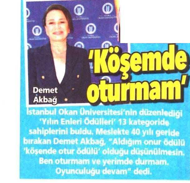 Meslekte 40 yılı geride bırakan Demet Akbağ, “Bu güzel salonda bulunmaktan keyif duydum. Gençler çok şahane. Gençlerin hala ilgi odağında olmak, benim yaşımda bir oyuncu için mutluluk verici” dedi. Akbağ “Ancak aldığım onur ödüllerinin köşende otur ödülü olduğu düşünülmesin. Ben oturmam ve yerimde durmam. Oyunculuğa devam” sözleriyle konuşmasını tamamladı.
